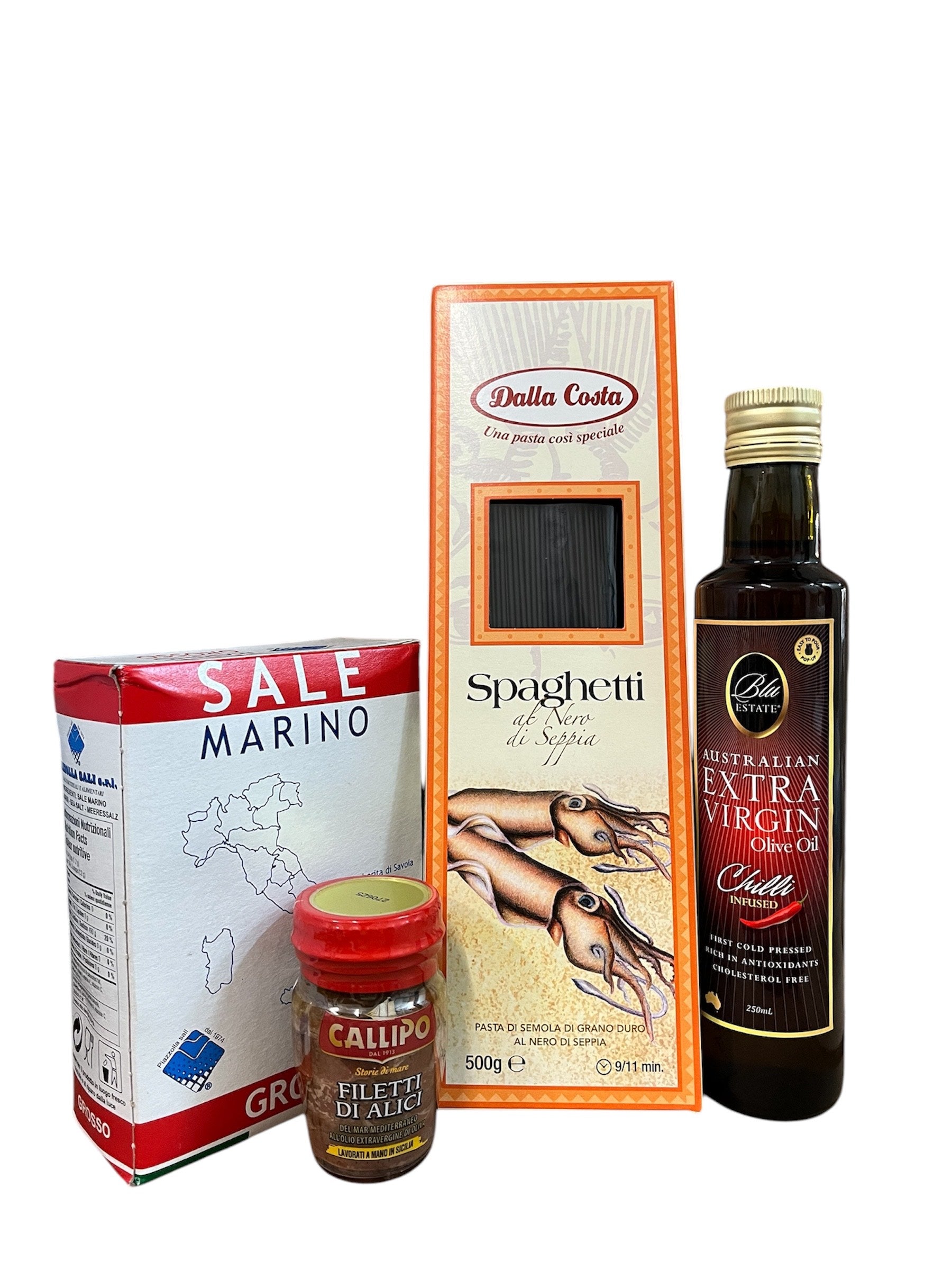 Dramatic, delicious, and unmistakably Italian—this squid ink spaghetti set delivers bold flavor with zero fuss. Paired with premium anchovy fillets, chili-infused olive oil, and sea salt, it's everything you need for a gourmet dinner in minutes.